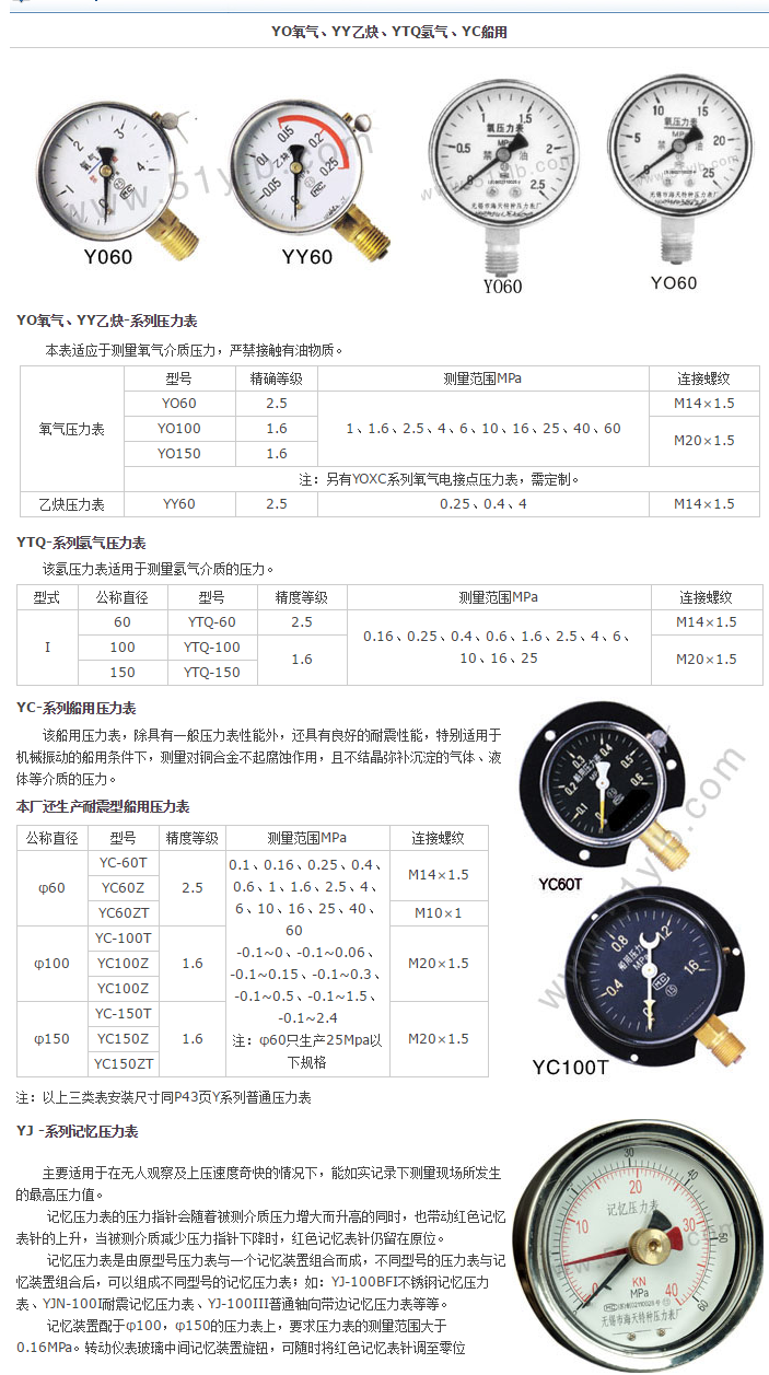 產品分類:YO氧氣、YY乙炔、YTQ氫氣、YC船用、YJ記憶-系列壓力表